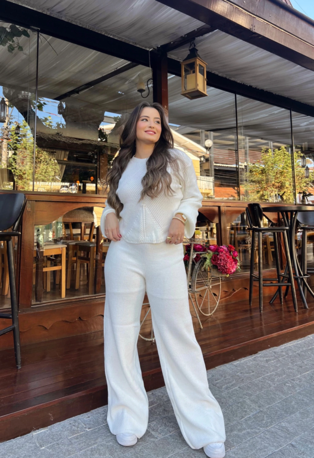 A blusa possui mangas amplas e uma trama trabalhada que adiciona um toque especial ao visual, enquanto a calça em modelagem wide leg com trama canelada proporciona um estilo moderno e despojado.